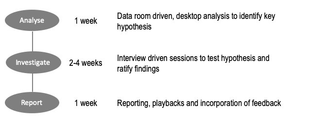 ASSESS is a rapid, but detailed, exercise. Depending on the complexity/scale of the IT functions and ease of access to data/stakeholders, the exercise takes between 4-6 weeks. Given the time and sensitivity aspects of M&A transactions, we have modularised this service, and can deliver the relevant parts in short time periods. In idle scenarios, the service will be delivered in 3 phases, as below: